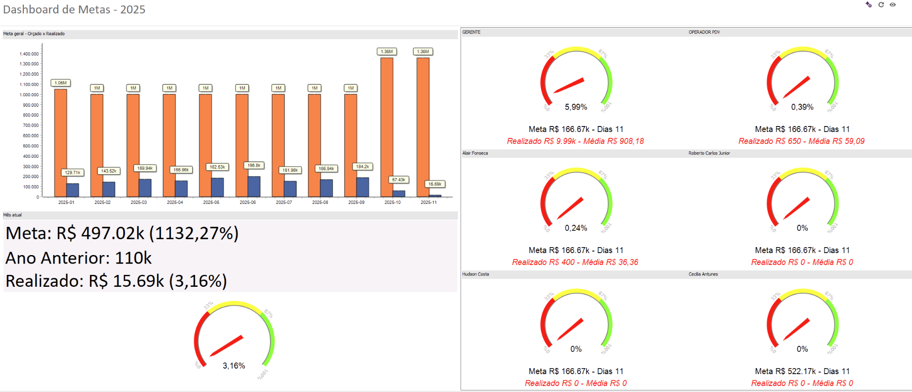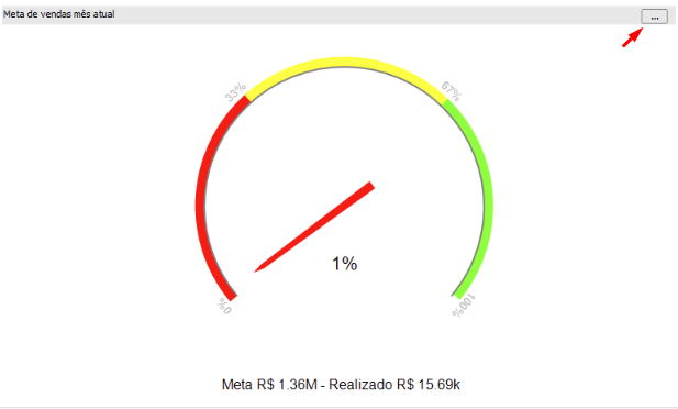 O gráfico Meta de vendas mês atual tem um botão no canto superior direito na qual podemos avaliar detalhadamente a meta geral, e por vendedores.