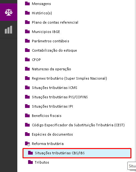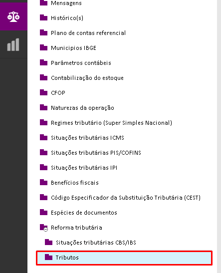 Contabilidade > Cadastros > Reforma Tributária > Tributos