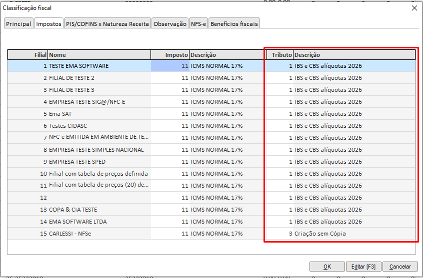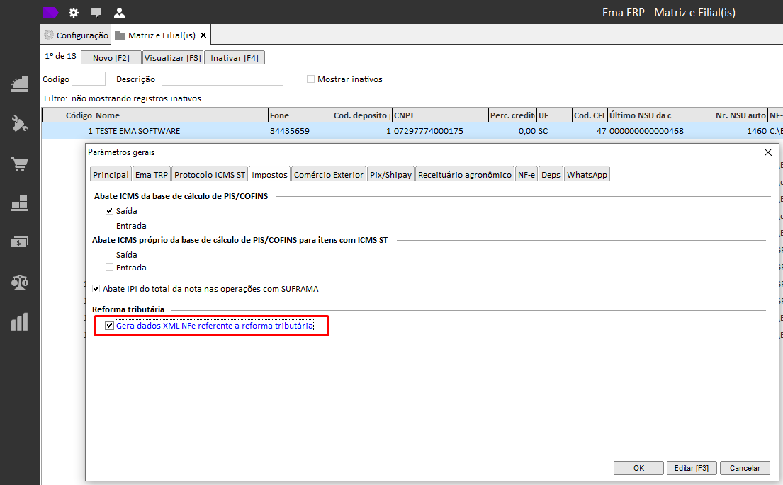 Para adequação dos sistemas Ema à Reforma Tributária, foi implementado um novo parâmetro nas configurações de Matriz/Filial do módulo Ema ERP.