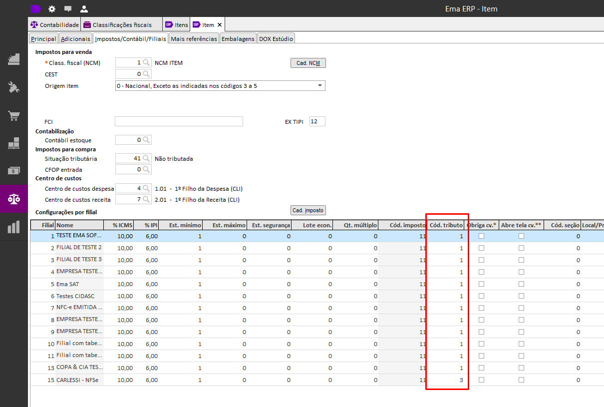 📂 Caminho de acesso:Ema ERP > Estoque > Cadastros > Itens > Aba: Impostos/Contábil/Filiais
