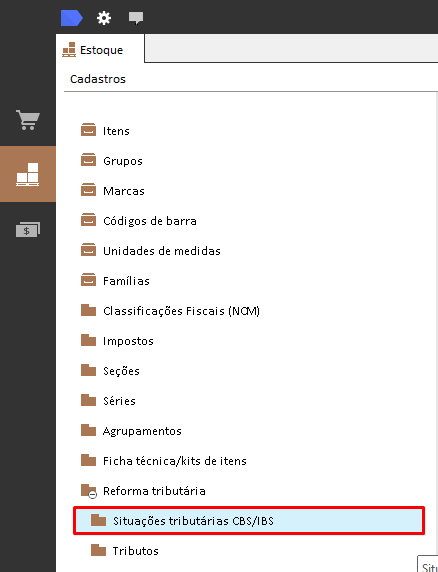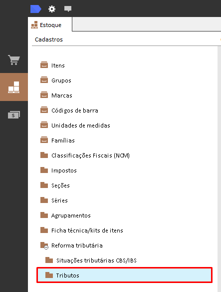 Estoque > Cadastros > Reforma Tributária > Tributos