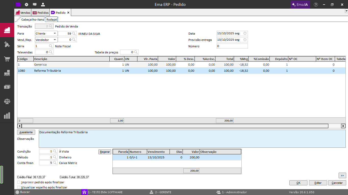 Ema ERP / Ema ERPx:Vendas > Operações > Criar Pedido