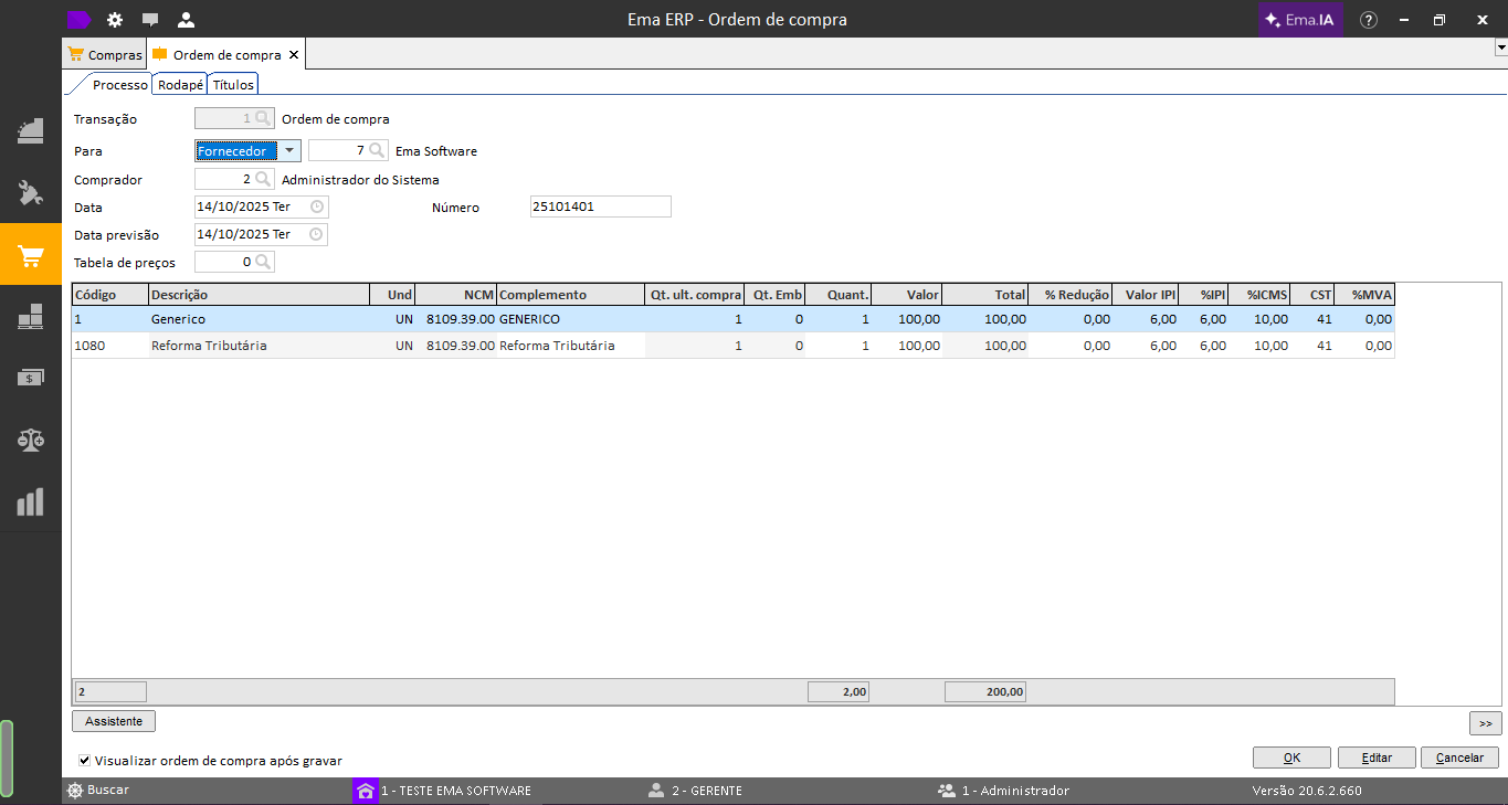 Ema ERP / Ema ERPx:Compras > Operações > Criar Ordem de Compra