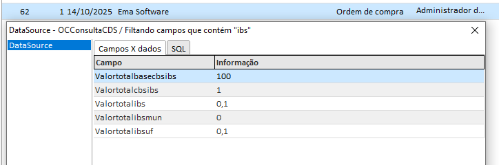 Ao consultar todos os dados da Ordem de Compra [CTRL + SHIFT + D], os seguintes campos estarão disponíveis: