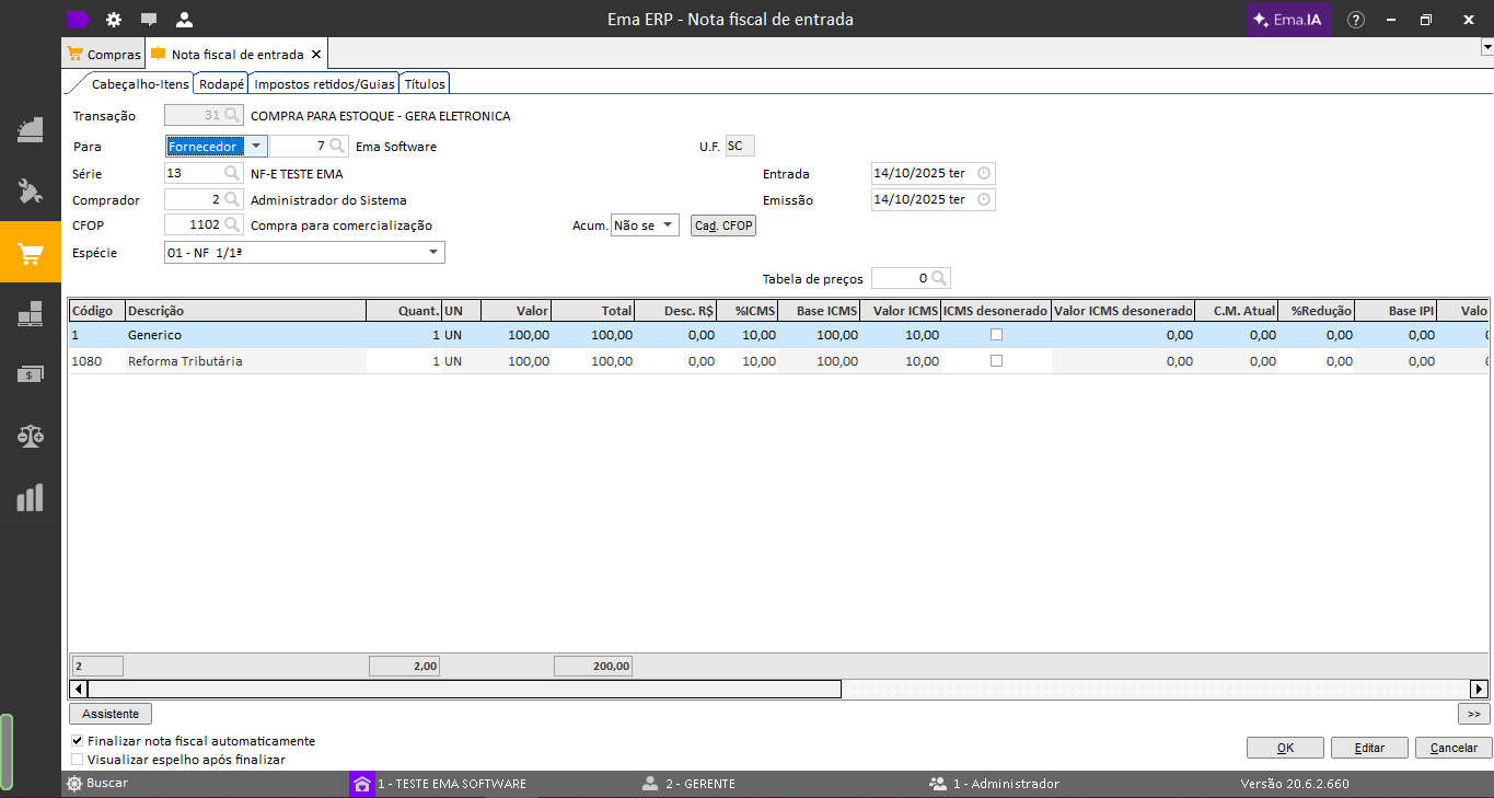 Ema ERP / Ema ERPx:Compras> Operações > Criar nota fiscal de entrada