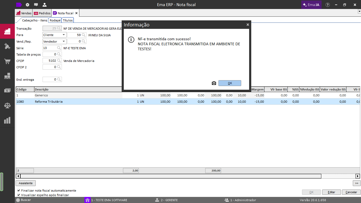 Ema ERP / Ema ERPx:Vendas > Operações > Criar nota fiscal de saída