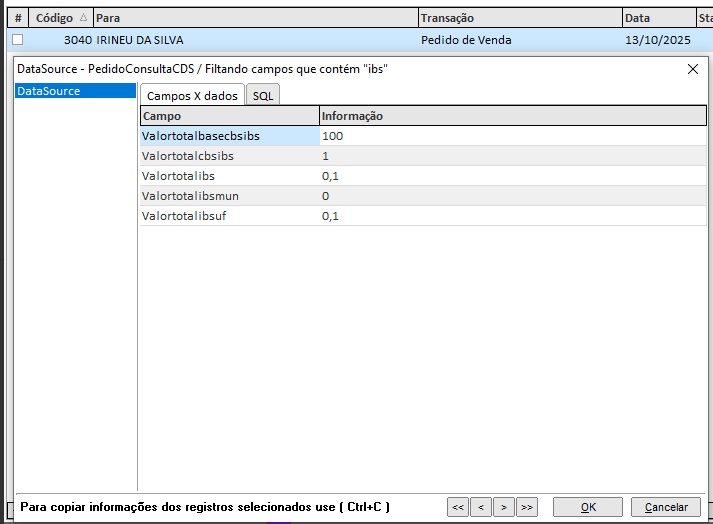 Ao consultar todos os dados do Pedido [CTRL + SHIFT + D], os seguintes campos estarão disponíveis:
