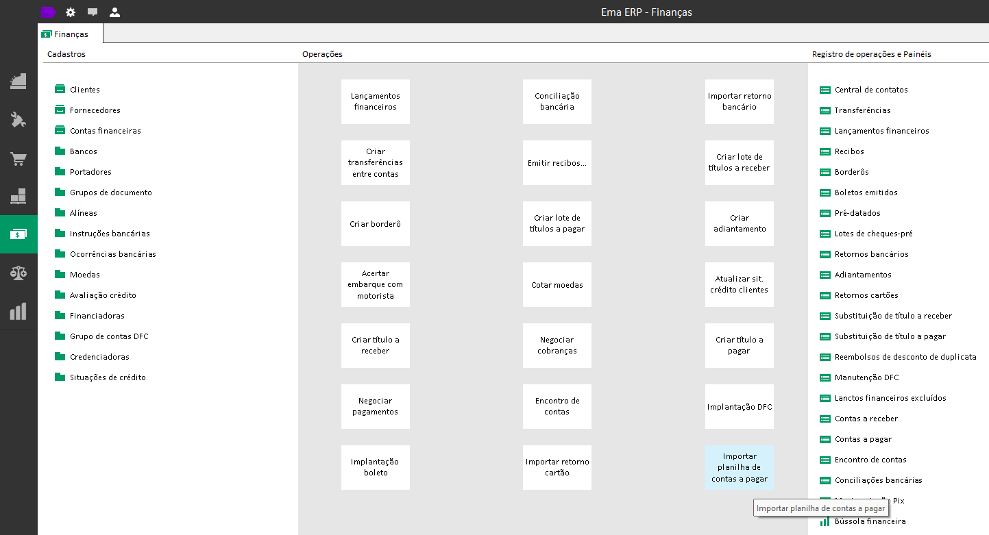 - Acessos no ERPx e ERP em Financas > "Importar planilha de contas a pagar" com objetivo de automatizar a criação de títulos a pagar a partir de planilha.