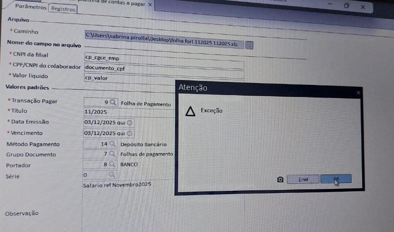 - Se tentar importar o arquivo e por ventura a planilha estiver aberta, vai dar erro 'Exceção' conforme ilustrado na imagem abaixo